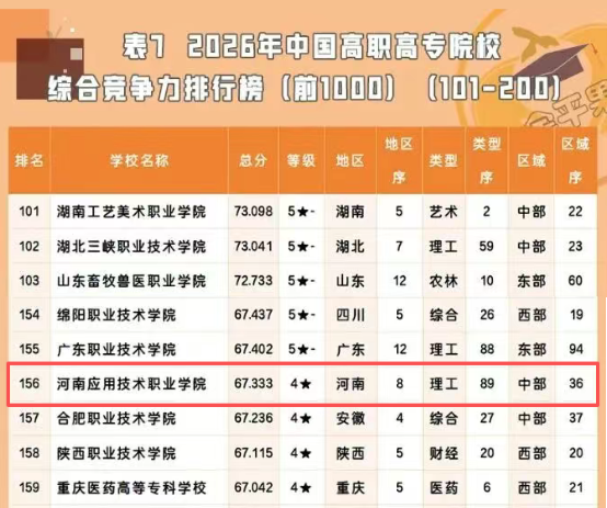 近日,由杭州电子科技大学中国科教评价研究院、浙江高等教育研究院等联合发布的“金平果”2026年中国高职院校综合竞争力排行榜正式揭晓。我校凭借过硬办学实力与显著发展成效,在全国1554所高职高专院校中位列第156位,较上一年度大幅提升67位;在河南省内排名跃升至第8位,较上年提升3位,实现全国、省内排名双跃升、双突破,再创历史最好成绩!